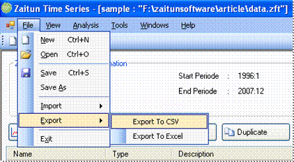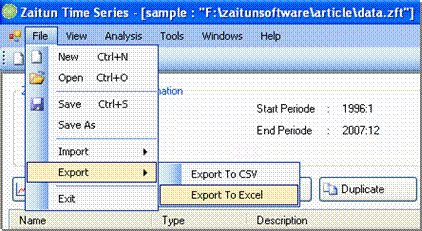 Zaitun Time Series provides a facility to export the data created by Zaitun Time Series to another format. There are 2 formats available, CSV file and Excel File. Zaitun Time Series will export all of variables in the current project into a new CSV or Excel File, but it will not export the group data and the result data.