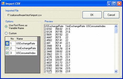 - The Import CSV dialog appear. The CSV file can’t contain non numeric fields except in the first line, which will be the variable name. Make sure the “Use First Row as Variable Name” option is checked if your CSV File contains variable name information. Then, select variables you want to import by making a mark on some check boxes in the variable grid.