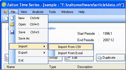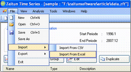 Zaitun Time Series provides a facility to import the data created by another software in a specified format. Zaitun Time Series provides a tool to import the data from CSV file (.csv) and Excel file (.xls).