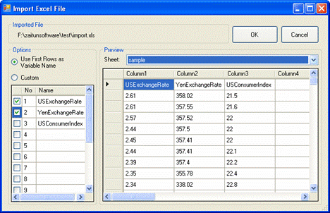 - The Import Excel File dialog appear. The Excel file can’t contains non numeric field field except the first row, which will be the variable name. Make sure the “Use First Row as Variable Name” option is checked if your Excel File contains variable name information. Then, select variables you want to import by making a mark on some check boxes in the variable grid. You can switch between sheets by selecting the sheet combo box in the Preview Pane.